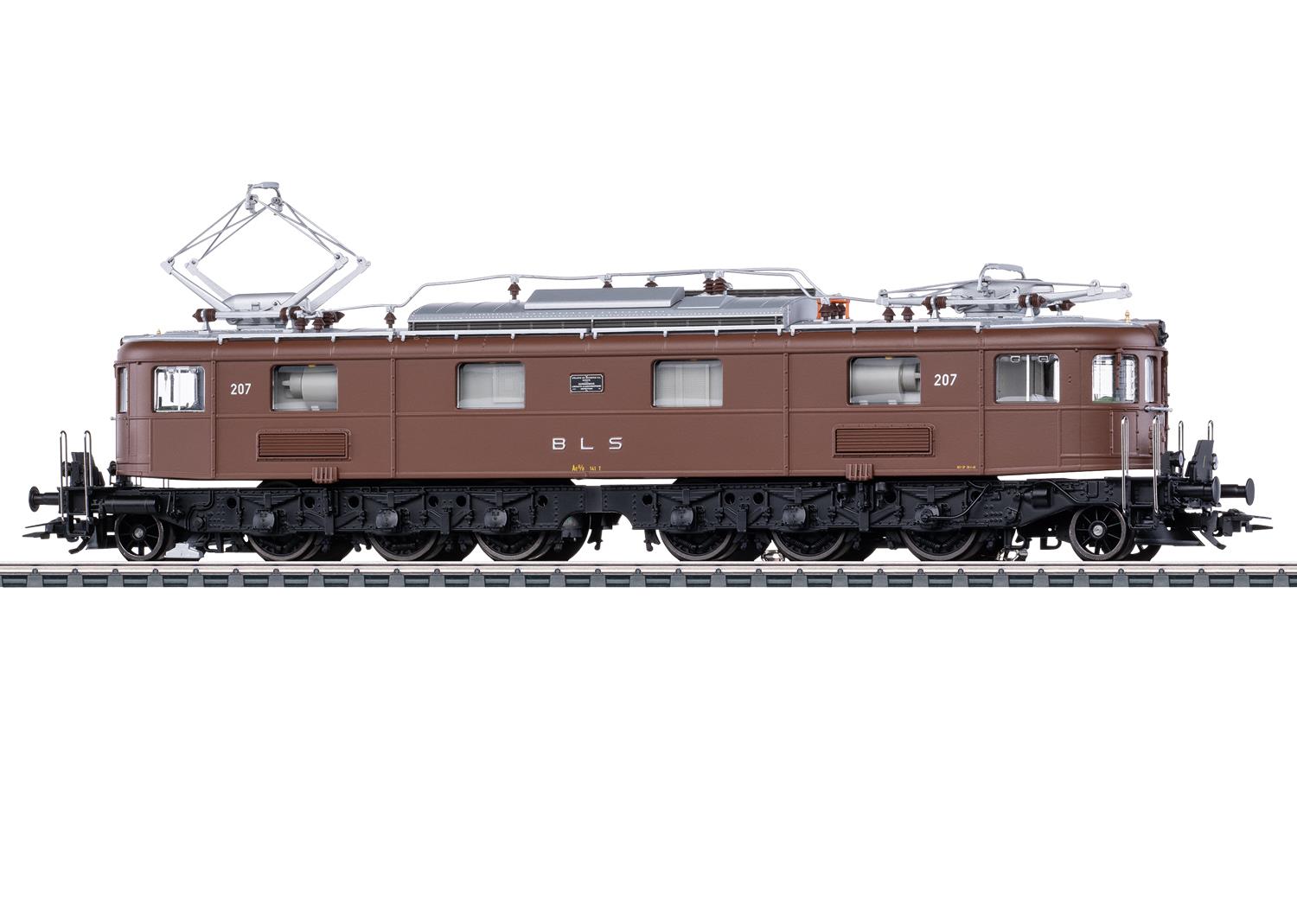 Modell: Mit Digital-Decoder mfx+ und umfangreichen Geräusch- und Lichtfunktionen. Geregelter Hochleistungsantrieb mit Schwungmasse, zentral eingebaut. Jeweils beide äußeren Treibradsätze in jedem Treibgestell über Kardan angetrieben. Haftreifen. Fahrtrichtungsabhängig wechselndes Dreilicht-Spitzensignal und 1 weißes Schlusslicht (Schweizer Lichtwechsel) konventionell in Betrieb, digital schaltbar. Beleuchtung umschaltbar bei Solofahrt auf 1 rotes Schlusslicht. Falschfahrsignal separat digital schaltbar. Spitzensignal an Lokseite 2 und 1 jeweils separat digital abschaltbar. Doppel-A-Licht-Funktion. Zusätzliche Führerstandbeleuchtung, Führerpultbeleuchtung und Maschinenraumbeleuchtung jeweils separat digital schaltbar. Beleuchtung mit wartungsfreien warmweißen und roten Leuchtdioden (LED). Mit Pufferspeicher. Hochdetaillierte Metall-Ausführung mit vielen separat angesetzten Einzelheiten. Befahrbarer Mindestradius 360 mm. Bremsschläuche und Schraubenkupplungsimitationen liegen bei. Länge über Puffer23,3 cm.