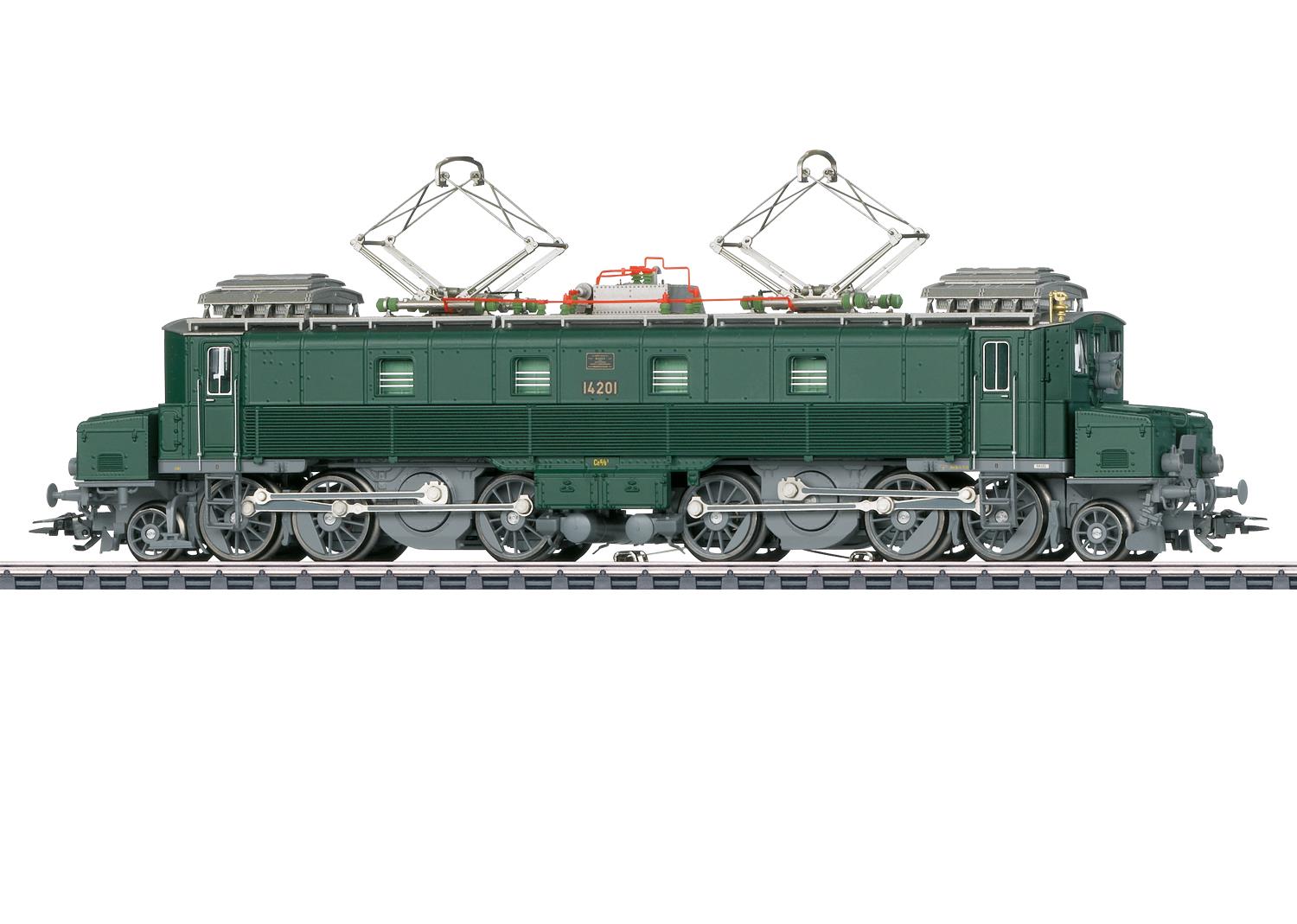 Modell: Mit Digital-Decoder mfx+ und umfangreichen Geräusch- und Lichtfunktionen. Geregelter Hochleistungsantrieb mit Schwungmasse, zentral eingebaut. Jeweils 3 Treibräder und Blindwelle in den beiden Treibgestellen über Kardan angetrieben. Haftreifen. Kurvengängiges Gelenkfahrwerk. Fahrtrichtungsabhängig wechselndes Dreilicht-Spitzensignal und 1 weißes Schlusslicht (Schweizer Lichtwechsel) konventionell in Betrieb, digital schaltbar. Beleuchtung umschaltbar bei Solofahrt auf 1 rotes Schlusslicht. Falschfahrsignal separat digital schaltbar. Spitzensignal an Lokseite 2 und 1 jeweils separat digital abschaltbar. Doppel-A-Licht-Funktion. Zusätzliche Führerstandbeleuchtung und Maschinenraumbeleuchtung jeweils separat digital schaltbar. Beleuchtung mit wartungsfreien warmweißen und roten Leuchtdioden (LED). Mit Pufferspeicher. Hochdetaillierte Metall-Ausführung mit vielen separat angesetzten Einzelheiten, wie Kühlröhren für das Transformatorenöl. Führerstand- und Maschinenraum-Nachbildung. Mit Besandungsanlage an den Treibradgruppen. Detaillierte Dachausrüstung mit Heizwiderständen, Dachleitungen, Isolatoren und Dachlaufbretter sowie Scherenstromabnehmer mit doppeltem Schleifstück. Befahrbarer Mindestradius 360 mm. Bremsschläuche und Schraubenkupplungsimitationen sowie Aufstiegstritte liegen bei.