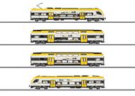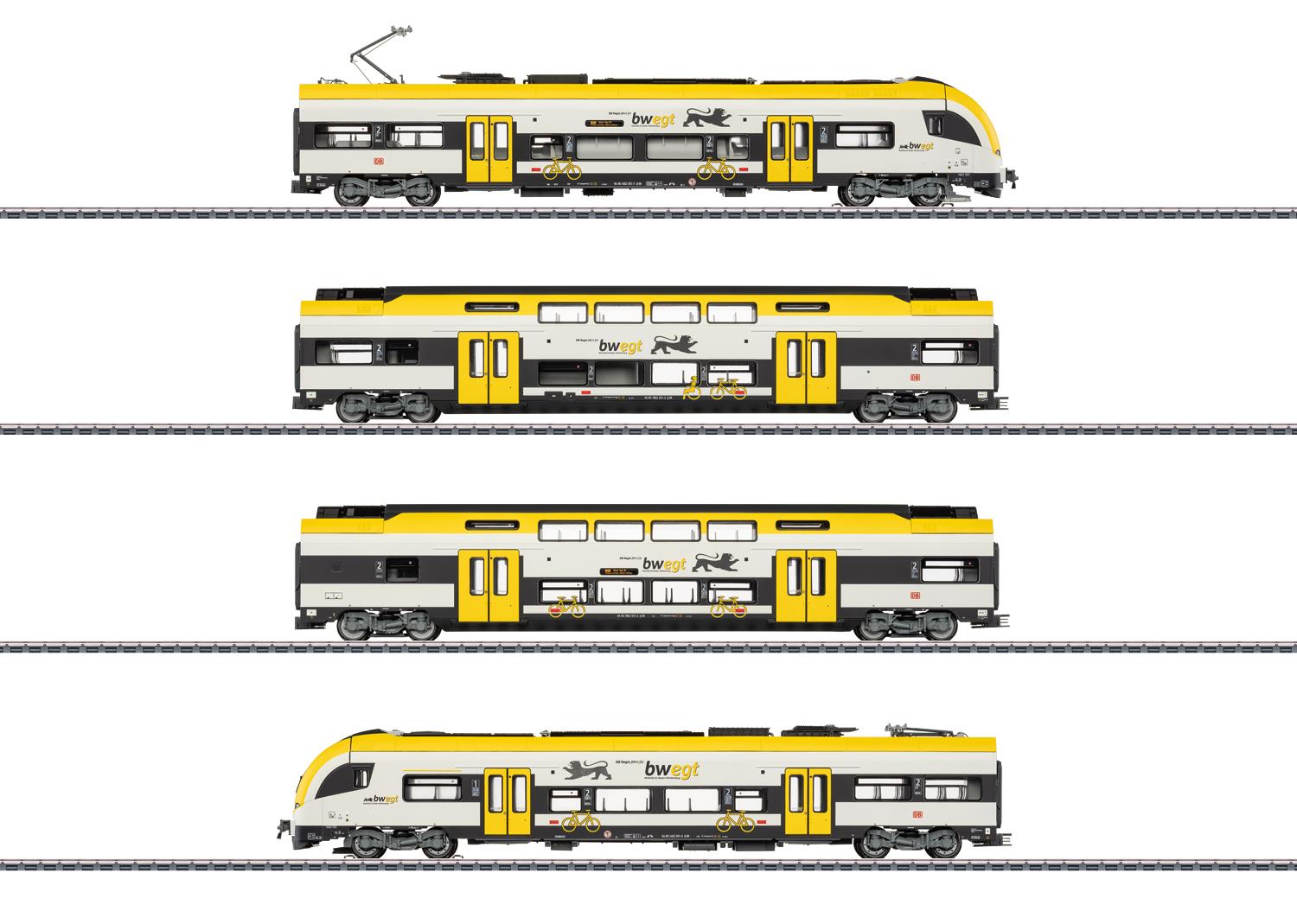 Modell: Mit Digital-Decoder mfx+ und umfangreichen Geräusch- und Lichtfunktionen. Geregelter Hochleistungsantrieb mit Schwungmasse im Endwagen A zentral eingebaut. Alle vier Achsen in beiden Drehgestellen über Kardan angetrieben. Haftreifen. Fahrtrichtungsabhängige Stromversorgung über den jeweils vorderen Endwagen. Spezial-Kurzkupplungen mit Kulissenführung. Fahrtrichtungsabhängig wechselndes Dreilicht-Spitzensignal und zwei rote Schlusslichter, konventionell in Betrieb, digital schaltbar. Doppel-A-Lichtfunktion. Fernlicht vorbildgerecht in zwei Intensitäten, Führerstands- und Führerpultbeleuchtung sowie Beleuchtung der Zugzielanzeigen an den Fronten und Seiten digital schaltbar. Serienmäßig eingebaute LED-Innenbeleuchtung. In jedem Wagen ist ein Pufferkondensator zur Überbrückung von kurzfristigen stromlosen Stellen eingebaut. Die Innenbeleuchtung wird versorgt über die durchgehende elektrische Verbindung des ganzen Zuges. Gesamte Beleuchtung mit wartungsfreien warmweißen und roten Leuchtdioden (LED). Mehrfarbige Inneneinrichtungen. Stromabnehmer digital heb- und senkbar. Viele separat angesetzte Details. Befahrbarer Mindestradius 360 mm. Länge des Zuges ca. 112,6 cm.