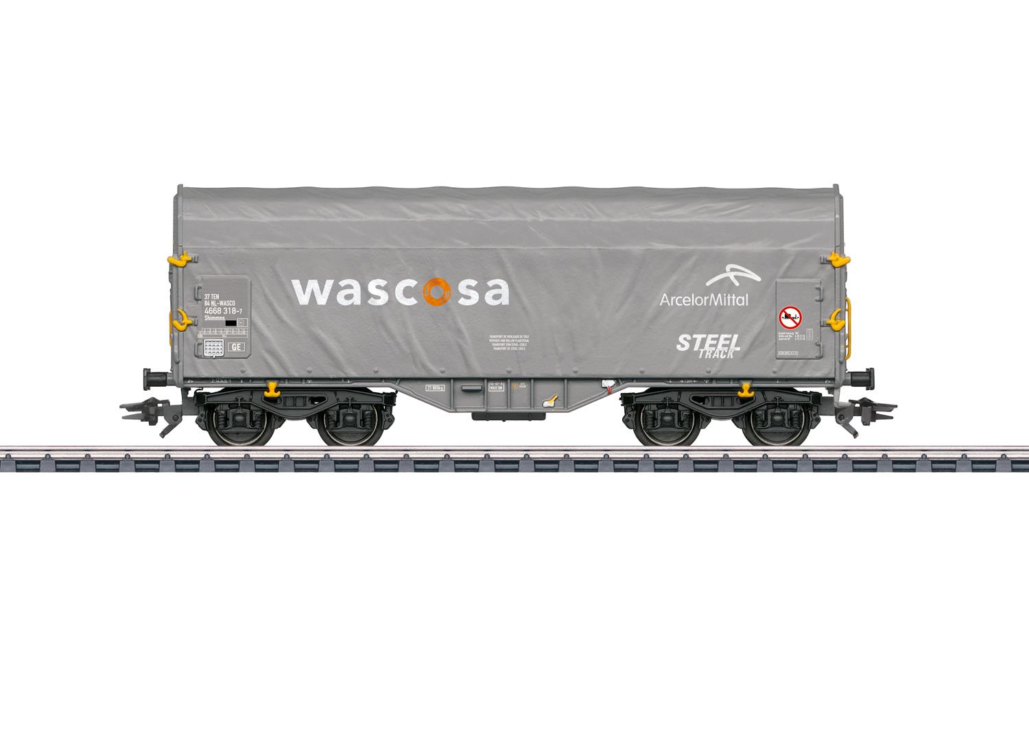 Modell: Wagen mit geschlossener Plane. Drehgestelle der modernen Bauform Y25 mit Doppelbremsklötzen.