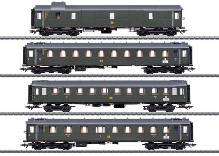 Modell: Detaillierte Ausführung im vollen Längenmaßstab. Befahrbarer Mindestradius 360 mm. Drehgestelle der Bauart Görlitz II schwer für die Wagen der Einheitsbauart 1928-30, sowie Schwanenhals-Drehgestelle für den der Bauart 1923 "Hecht". Aufstiegsleitern und angesetzte Griffstangen. Teilweise mehrfarbige Inneneinrichtungen. Aufgedruckte Wagenlaufschilder und Ordnungsnummern. Kurze Faltenbälge liegen zum Tausch bei. Wagen der Bauart 1928-30 vorbereitet für den Einbau stromführender Kurzkpplungen 72024, LED-Innenbeleuchtung 73410/73411 und Schleifer 73406. Wagen der Bauart 1923 "Hecht" vorbereitet für den Einbau der stromführenden Kurzkupplungen 72022, LED-Innenbeleuchtung 73410/73411 und Schleifer 73404. Alle Wagen einzeln verpackt in zusätzlicher Umverpackung. Gesamtlänge über Puffer ca. 97 cm.
